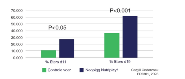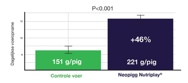 Praktijkproeven in België met Nutriplay laten zien dat dit leidt tot hogere voeropname en een verdubbeling van het aantal etende biggen per toom, ten opzichte van controlevoer (een standaard kruimel prestarter). De resultaten zijn te zien in Figuur 2 en 3.