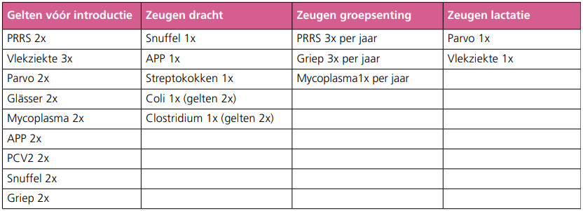 Veehouders – in samenwerking met hun dierenartsen – streven ernaar om het immuunsysteem van hun dieren optimaal te ondersteunen door middel van het optimaliseren van beïnvloedende factoren zoals bioveiligheid, voeding, genetica en vaccinatie. Met als doel uitbraak van ziekte te voorkomen in plaats van te genezen. Dit heeft zich vertaald in een toename van het aantal vaccins dat gebruikt wordt op een bedrijf, zowel bij de biggen als bij de zeugen. Denk hierbij aan het aantal injecties bij gelten voor introductie in de zeugenstapel, of het aantal vaccinaties bij de zeugen einde dracht. Een realistisch voorbeeld van een vaccinatieschema bij een zeugenstapel wordt in tabel 1 weergegeven. Het is hierbij snel duidelijk dat het combineren van vaccinaties kan helpen in het verminderen van het aantal injecties.
