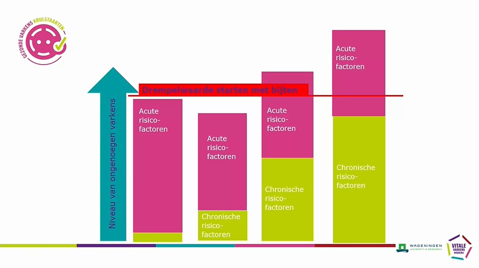 Van de Hoef laat een afbeelding zien waarop te zien is hoe chronische en acute risicofactoren samen het moment bepalen waarop een varken zich niet happy voelt en kan gaan bijten. Het is dus belangrijk om de chronische risicofactoren zo laag mogelijk te houden, zodat er bij optreden van acute risicofactoren niet meteen bijtgedrag optreedt.