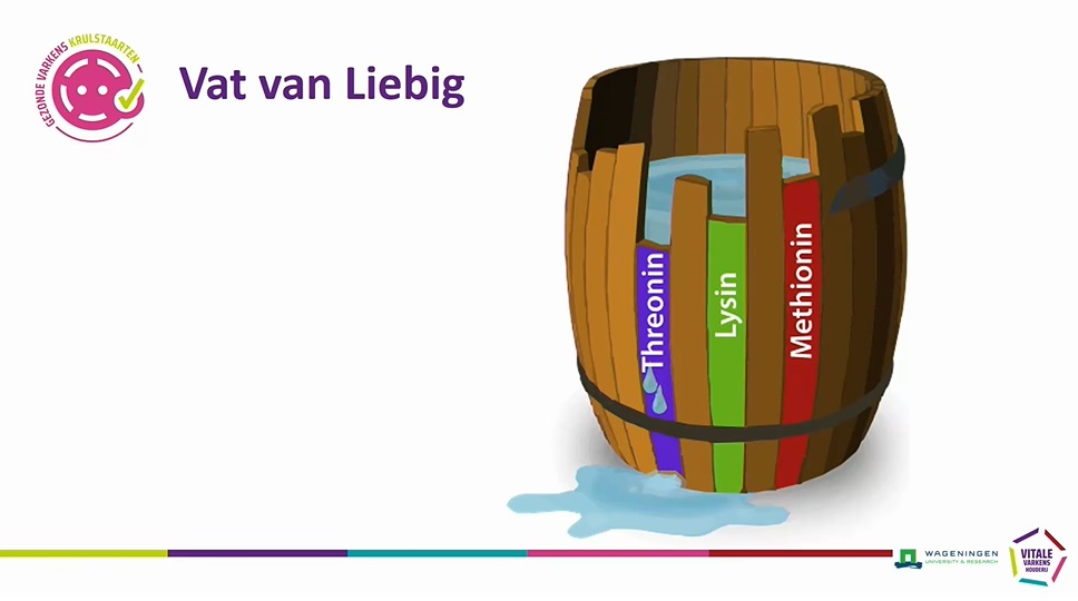 Een ander belangrijk onderdeel zijn aminozuren. Ruw eiwit is opgebouwd uit verschillende aminozuren. Het is dan van belang dat alle benodigde aminozuren in voldoende mate aanwezig zijn. Van de Hoef laat dit zien met het Vat van Liebig. Dit illustreert dat tekort aan één aminozuur ervoor zorgt dat het vat leegstroomt, met andere woorden, het ruw eiwit kan niet goed opgebouwd worden.