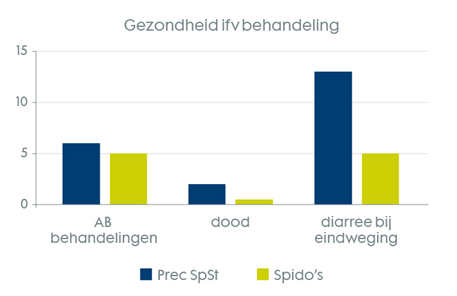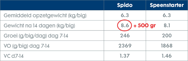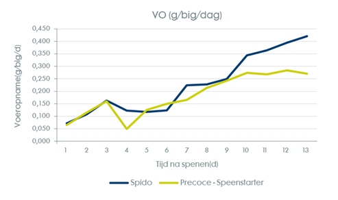 Om de resultaten van Milkiwean Spido inzichtelijk te maken, werden met uiteenlopende biggen (o.a. lichte- en zwaargespeende biggen en verschillende genetica) proeven gedaan. Biggen die op Milkiwean Spido zaten en pas na 1 week over gingen op een speenstarter, bleken veel vlotter op te starten dan de biggen die na 500 gram Precoce al overgingen op een speenstarter. Ook de voeropname van de Spido-groep bleek beter (figuur 1).