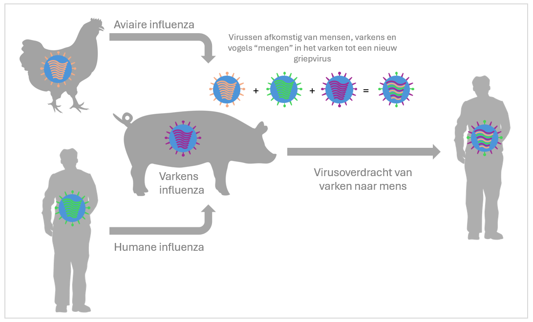 Omdat een varken zowel met Influenza A virussen van varkens als van mensen en vogels kan geïnfecteerd worden, worden het varken ook wel een “mengvat” voor griepvirussen genoemd. Wanneer een varken tegelijk met 2 of meer griepvirussen besmet wordt, dan kan er door de uitwisseling van genetisch materiaal tussen deze virussen een nieuw griepvirus ontstaan. Zo kunnen griepvirussen van de mens, het varken en vogels met elkaar vermengen en ontstaat er een zogenaamde “reassortant”. Afhankelijk van de eigenschappen van dit virus kan dit meer kliniek veroorzaken bij de varkens zelf en/of kan er een griepvirus ontstaan dat gemakkelijker van het varken naar de mens wordt overgedragen. De kans is klein dat er een reassortant ontstaat die gemakkelijk van het varken naar de mens wordt overgedragen en die zich vervolgens snel van mens tot mens verspreidt. Maar wanneer dit toch zou gebeuren, dan zijn de gevolgen groot, omdat er op deze manier een nieuwe pandemie kan ontstaan.