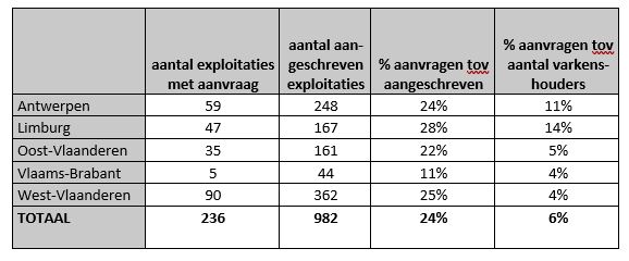 980 landbouwbedrijven kwamen volgens de voorwaarden in aanmerking en werden daarover geïnformeerd door de Vlaamse Landmaatschappij. Met het voorziene bedrag van 200 miljoen euro zou ongeveer 2/3 van de bedrijven steun kunnen krijgen voor de stopzetting van de varkensstallen. 236 landbouwers of 24% van de landbouwers die in aanmerking kwamen, hebben een aanvraagdossier ingediend bij de Vlaamse Landmaatschappij. Dat betekent dat er voldoende budget is om alle aanvragen die aan de voorwaarden voldoen ook goed te keuren.