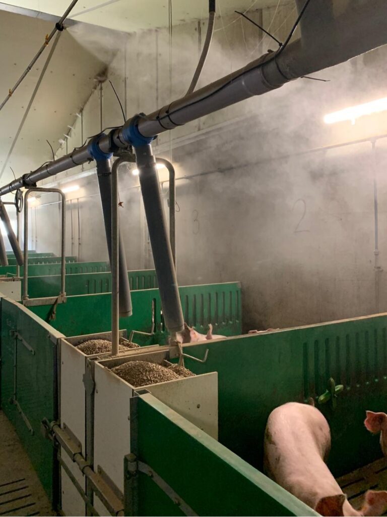 Binnen het overkoepelende VLAIO project COOLPIGS testten ILVO en UGent ook staltechnische oplossingen. Hogedrukverneveling verlaagt de staltemperatuur met 2,5°C en zorgt ervoor dat de varkens rustiger ademen (ademhalingsfrequentie daalt met 8%).