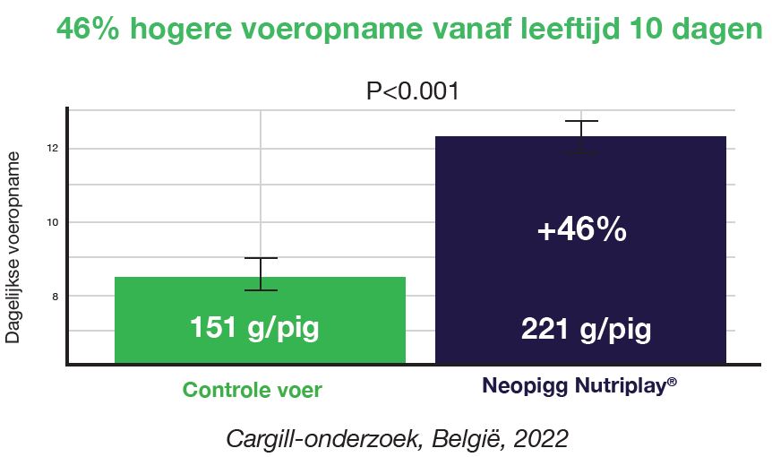 Nutriplay® dat onderdeel is van de Neopigg® voerlijn, heeft een gevarieerde samenstelling van ruwvoer, gecoat met zoete en hartige smaken. Het sluit hiermee perfect aan bij de behoeftes en het natuurlijk zoek- en foerageergedrag van jonge biggen. Recente praktijkproeven laten zien dat dit leidt tot hogere voeropname en een verdubbeling van het aantal vretende biggen per toom (Figuur 2 en 3).
