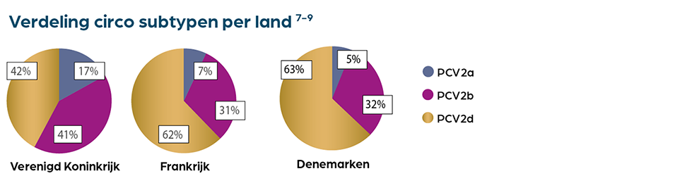 De situatie in België en Nederland staat niet op zich. Wereldwijd3-5 en ook in Europa6 is PCV2d inmiddels de meest voorkomende variant. In onderstaande cirkeldiagrammen is te zien hoe de verdeling van de verschillende PCV2 subtypen in de ons omringende landen is vastgesteld.