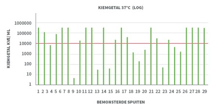 Bij een bacteriologisch onderzoek van 29 vaccinspuiten, afkomstig van 11 bedrijven, bleek dat 41% van de spuiten een kiemgetal aangeeft van > 150.000 KVE/ ml. Dit betekent dat behalve 2 ml vaccin, er meteen ook > 300.000 bacteriën worden mee ingespoten.