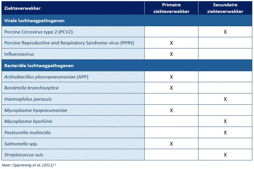 Bij het Porcine Respiratory Disease Complex (PRDC) spelen verschillende virale en bacteriële ziekteverwekkers een rol. Sommige ziekteverwekkers kunnen zelfstandig luchtwegproblemen veroorzaken vanwege hun eigen ziekteverwekkend vermogen. Dit worden primaire ziekteverwekkers genoemd. Andere ziekteverwekkers veroorzaken alleen problemen in combinatie met andere ziekteverwekkers (co-infecties) of niet-infectieuze factoren (cofactoren). Dit worden secundaire ziekteverwekkers genoemd. In de onderstaande tabel zijn enkele veelvoorkomende ziekteverwekkers ingedeeld op basis van hun vermogen om zelfstandig of enkel bij aanwezigheid van co-infecties of cofactoren luchtwegproblemen te veroorzaken.