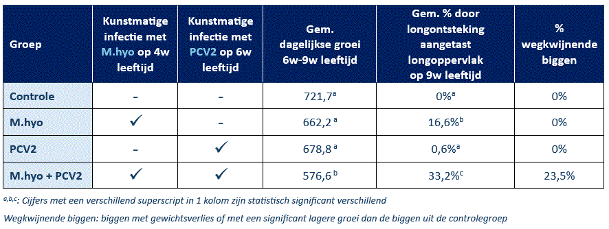 De sterfte en dagelijkse groei van 6 tot 17 weken leeftijd werden gemeten. Varkens die eerst een M.hyo-infectie doormaakten, gevolgd door een APP-infectie vier weken later, waren het zwaarst getroffen. Ze vertoonden ernstige longletsels en klinische symptomen zoals koorts en hoest. De gemiddelde dagelijkse groei was het laagst in deze groep, namelijk 650 g/dag, wat 282 g/dag lager was dan de niet-geïnfecteerde controlegroep (932 g/dag). Bovendien had deze groep de hoogste sterfte. Dit wijst erop dat M.hyo de ernst van een APP-infectie kan versterken.