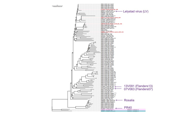 In een fylogenetische boom liggen verwante virussen dichtbij. Zo liggen PRRSV1 subtype 2 en 3 dichtbij elkaar (onderaan), terwijl dit virus ver weg ligt van het Lelystad virus (LV) (bovenaan). Bron: Presentatie Professor Dr. Hans Nauwynck, HIPRA Varkensproeverij 12 september 2024.