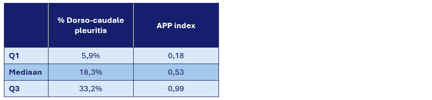 • APP index: deze index geeft informatie over de aanwezigheid en de omvang van dorsocaudale pleuritis letsels en moet zo laag mogelijk zijn.
