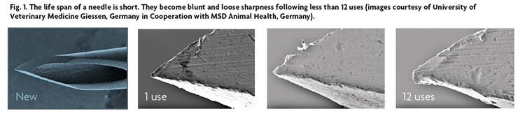 Bij speenvarkens en vleesvarkens wordt aangeraden de naald na 15 tot 20 dieren te vervangen. In kraamhokken is het beter om na elke toom een nieuwe naald te gebruiken. Te lang dezelfde naald gebruiken kan weefselbeschadiging veroorzaken en het risico op verspreiding van ziekte verhogen (zie de afbeelding).