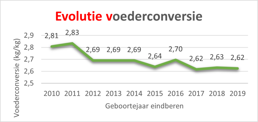 Aangezien de testwerking al vijf jaren diverse eindbeertypes aftest op dezelfde twee praktijkbedrijven, is het een ideale manier om na te gaan wat de evolutie is in de voederconversie over de jaren heen. Als ILVO de gemiddelde voederconversie uitzetten naar het geboortejaar van de eindbeer, zien ze een duidelijk positieve evolutie. Eindberen geboren in 2010 en 2011, geven nakomelingen die een gemiddelde voederconversie van ongeveer 2,80 hebben, terwijl de later geboren eindberen (2017, 2018 en 2019) een gemiddelde voederconversie geven van 2,62. Dit is een mooie evolutie van 200 gram minder voederverbruik per kg aangezet gewicht gedurende een periode van 10 jaar.