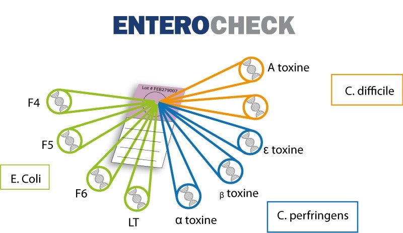 Alle ingestuurde Enterochecks worden met een qPCR getest op 9 targets, gericht op de belangrijkste virulentiefactoren en toxines van E. coli, Clostridium perfringens type A en C en Clostridium difficile.