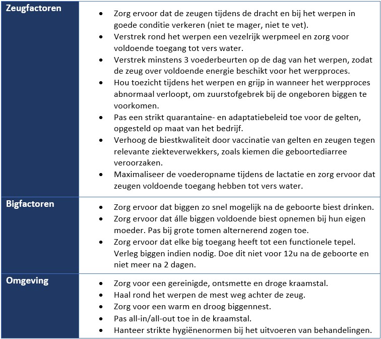 Het verminderen van de biggensterfte in het kraamhok is nog steeds een uitdaging. Een betere bigoverleving leidt tot betere economische resultaten en een beter dierenwelzijn. In dit artikel komen een aantal praktische tips aan bod, die bijdragen tot een betere bigoverleving. Zowel zeug-, big- als omgevingsfactoren worden daarbij onderscheiden.