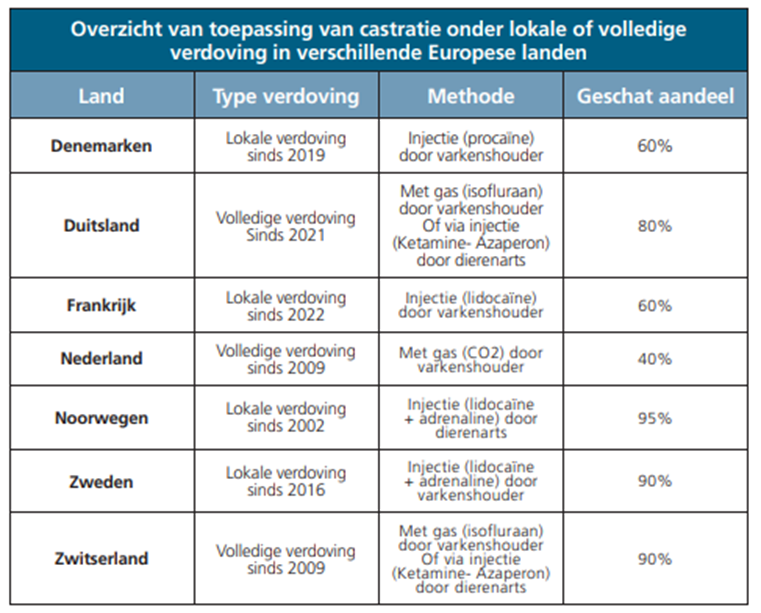 Onverdoofde biggencastratie staat al ruim 20 jaar op de agenda. Elk van de alternatieven, hetzij productie van intacte beren of immunocastraten, of castreren met verdoving heeft voor- en nadelen. De voorbije jaren maakte elk land en elke markt zijn eigen keuze voor één of meerdere van bovengenoemde alternatieven. Castratie onder lokale of volledige verdoving is sinds kort in meerdere buurlanden wettelijk verplicht. Ook in België moeten in de nabije toekomst een aantal knopen worden doorgehakt. Castratie met pijnbestrijding voldoet immers stilaan niet meer aan de marktverwachtingen. Dit artikel werpt een blik op de stand van zaken in Europa en belicht de huidige uitdagingen in België.