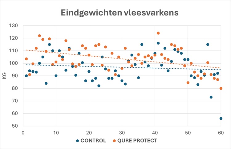 De proef met Qure Protect werd ingezet om de mate van groei, voerefficiëntie en verbetering van de gezondheid door het aanvullende voeder te testen bij gespeende biggen. Voor de proef werden biggen uit dezelfde speengroep na wegen gelijkmatig verdeeld over twaalf hokken met ieder veertien biggen. Vanaf dag 1 na spenen tot dag 28 na spenen kregen de biggen in de ene helft van de hokken voer met Qure Protect. De dosering was twee kilogram per ton voer. Dit in de vorm van brok waarin voerleverancier Vitelia Voeders de Qure Protect had meegeperst.