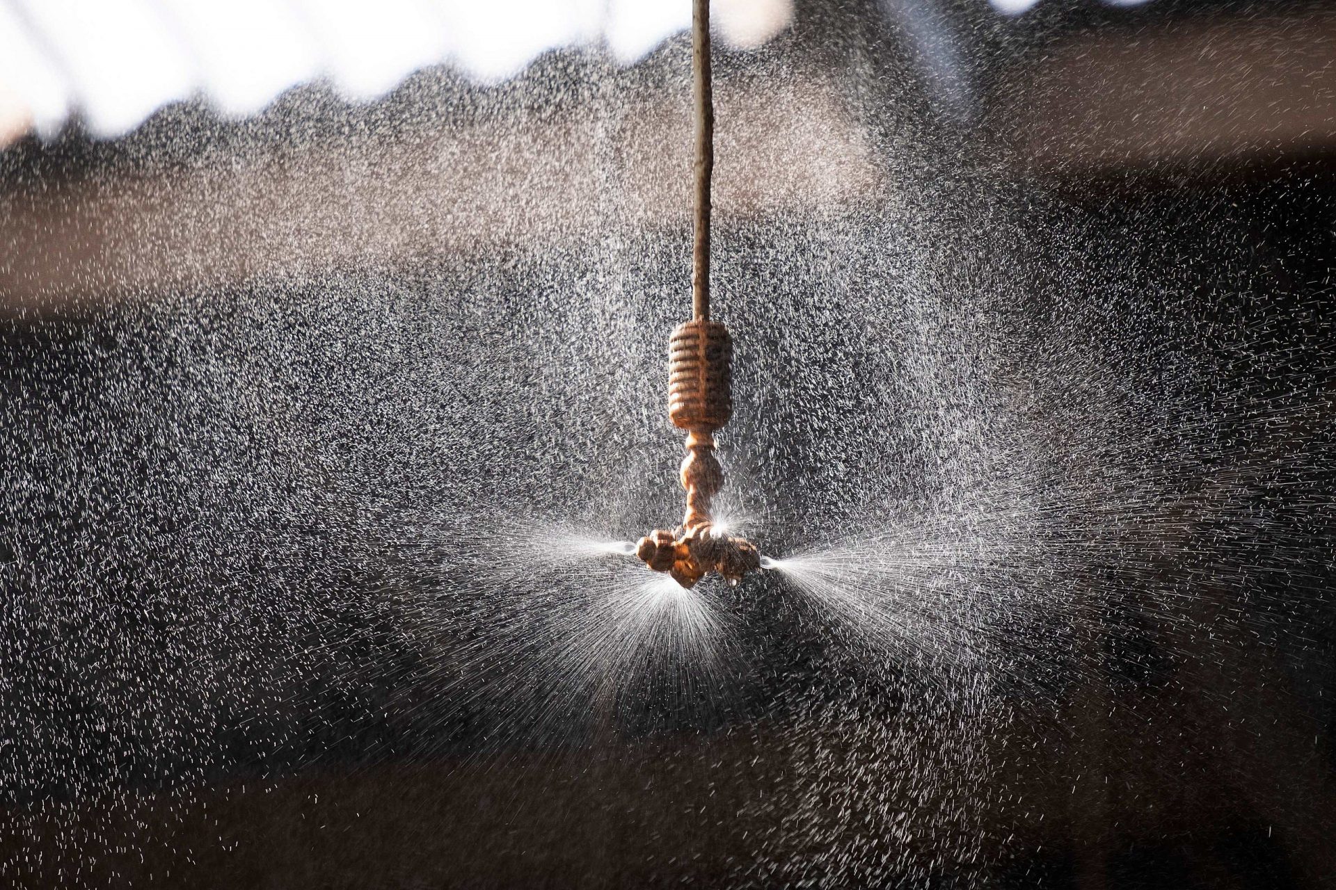 - Luchtbehandeling met waterverdamping – Door sproeien of vernevelen van water in de binnenkomende lucht, treedt er verdamping op en wordt dus warmte onttrokken aan de lucht, waardoor deze voelbaar kouder maar wel vochtiger wordt. Het systeem is vooral interessant als de relatieve vochtigheid van de buitenlucht laag is. Onder praktijkomstandigheden kan een temperatuurdaling van 4 à 5°C verkregen worden (koeling via pads en lage druk verneveling) of tot 6-8°C met hoge druk systemen. De efficiëntie van de systemen hangt af van de luchtvochtigheid. Hoe lager de luchtvochtigheid van de binnenkomende lucht, hoe meer de lucht gekoeld kan worden.