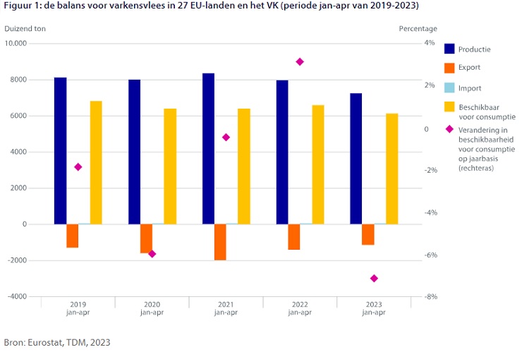 Het volume van varkensvlees dat beschikbaar is voor consumptie binnen Europa, is met zeven procent fors gedaald in de periode januari t/m april 2023 ten opzichte van dezelfde periode vorig jaar, zie de onderstaande figuur. Daarnaast nam ook de export af met 18 procent.