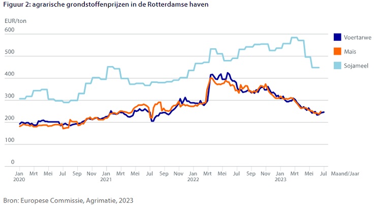 De druk vanuit retail om prijsstijgingen te beperken neemt wel toe. Maar in recente maanden konden slachterijen, met wat vertraging, hogere prijzen nog grotendeels verwaarden. De prijzen van belangrijke diervoedergrondstoffen in Europa keerden terug naar het niveau van voor de oorlog in Oekraïne. Begin juli zijn de graanprijzen licht gestegen in de afwachting van de verlenging van de graandeal. Maar de reactie op de graanmarkt op het nieuws dat Rusland van de graandeal uitstapte was tot nu toe relatief klein.