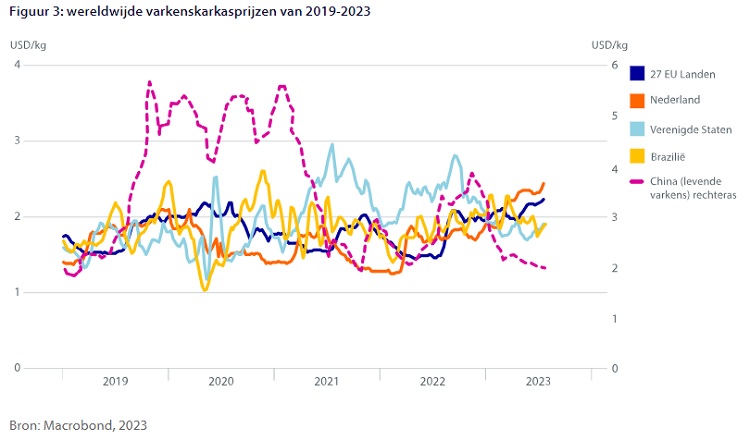 Terwijl de productieniveaus kelderden, bereikten de varkensprijzen nieuwe recordhoogtes. De gemiddelde karkasprijs in de EU was in week 25 van 2023 zo’n 29% hoger in vergelijking met dezelfde periode van 2022. Prijsbewegingen wijken sterk af van het gebruikelijke seizoenpatroon en zijn duidelijk gevoed door het lage aanbod van varkens. Ook voor het derde kwartaal van 2023 verwacht de Rabobank dat de opbrengstprijzen op een hoog niveau blijven. Ze verwachten namelijk niet dat het aanbod op korte termijn herstelt. De dalende trend in de Duitse varkensstapel houdt aan. In Denemarken sloot één van de slachterijen van Danish Crown, wat het signaal geeft dat ook zij een lager aanbod verwachten. De Spaanse sector heeft nog altijd te kampen met de gevolgen van de uitbraak van het PRRS-virus, die de productie zeker dit jaar blijft beperken.