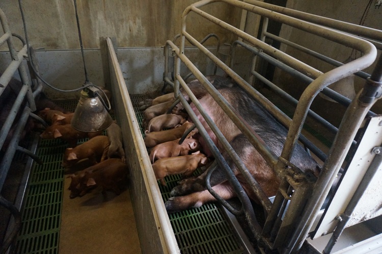 Het echtpaar bewoont een groot familiebedrijf, dus ook Yvan zijn voorouders boerden. Met groot bedoelen we ditmaal niet industrieel of megagroot. Dit is een gesloten varkensbedrijf met zestig zeugen. Voorheen was Yvan PIétrainfokker. Hij verkocht ook berensperma, want hij had een eigen KI- station. Uiteindelijk is hij overgestapt en Deense Duroc-beren gaan fokken, omdat hij op een mooie keer dat varkensvlees had geproefd, en het vlees veel lekkerder had bevonden dan van het ras dat hij had. Het intramusculair vet van het Duroc-ras geeft extra smaak en malsheid. En voornamelijk die lekkere smaak had hem daarin sterk overtuigd. Ook zijn slager beaamde datzelfde feit. En dit vlees kan ook antibioticavrij. Ook dit is een voordeel. Eerst werden de twee rassen wel nog gekruist. Uiteindelijk heeft hij zich volledig toegelegd op de opkweek van Duroc-varkens. In 2007 werd de eerste zeug gekocht. De biggen zitten in een zes-wekensysteem. Ze tellen vijf à tien biggen per zeug per worp.