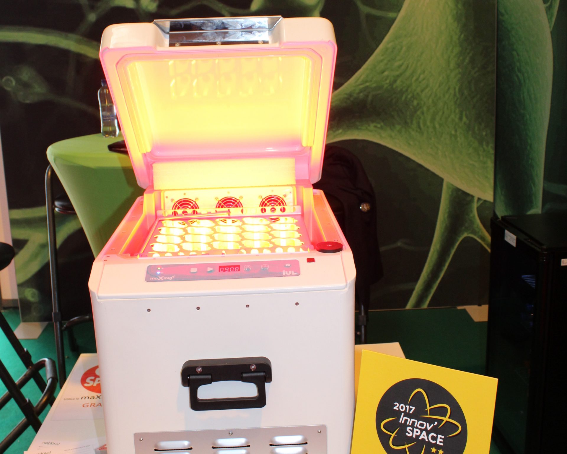 In de maxiPig (zie foto) krijgen de door de KI-stations op het varkensbedrijf aangevoerde spermadosissen een lichttherapie. Concreet wordt het sperma geactiveerd door LED-licht. “En dit met een specifieke golflengte volgens een strikt belichtingsprotocol”, verklaarde ons Tijl Vanmeenen. “Het effect is drieledig: de energievoorraad van de spermatozoïden vergroot, ze gaan zich rechtlijniger voortbewegen en hun capaciteitsvermogen verbetert.”
