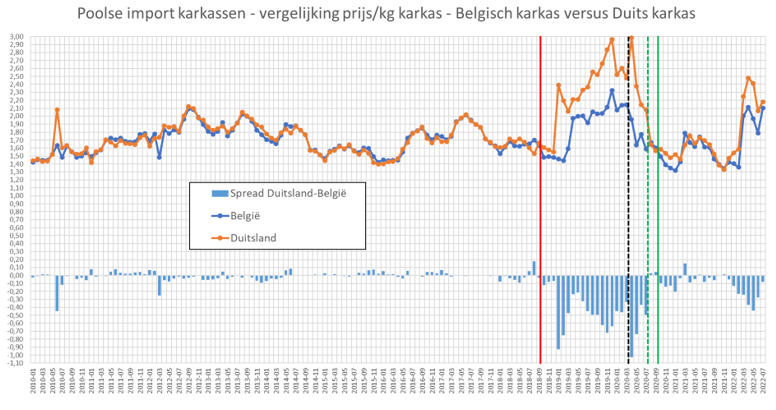 We zien dat vanaf januari 2022 de spread weer duidelijk toeneemt. Terwijl de sanitaire toestand (corona en AVP) in beide landen gelijk is.Voor de eerste 7 maanden van 2022 kijken we zo toch weer aan tegen een gemiddeld verschil van 25 cent per kilogram.