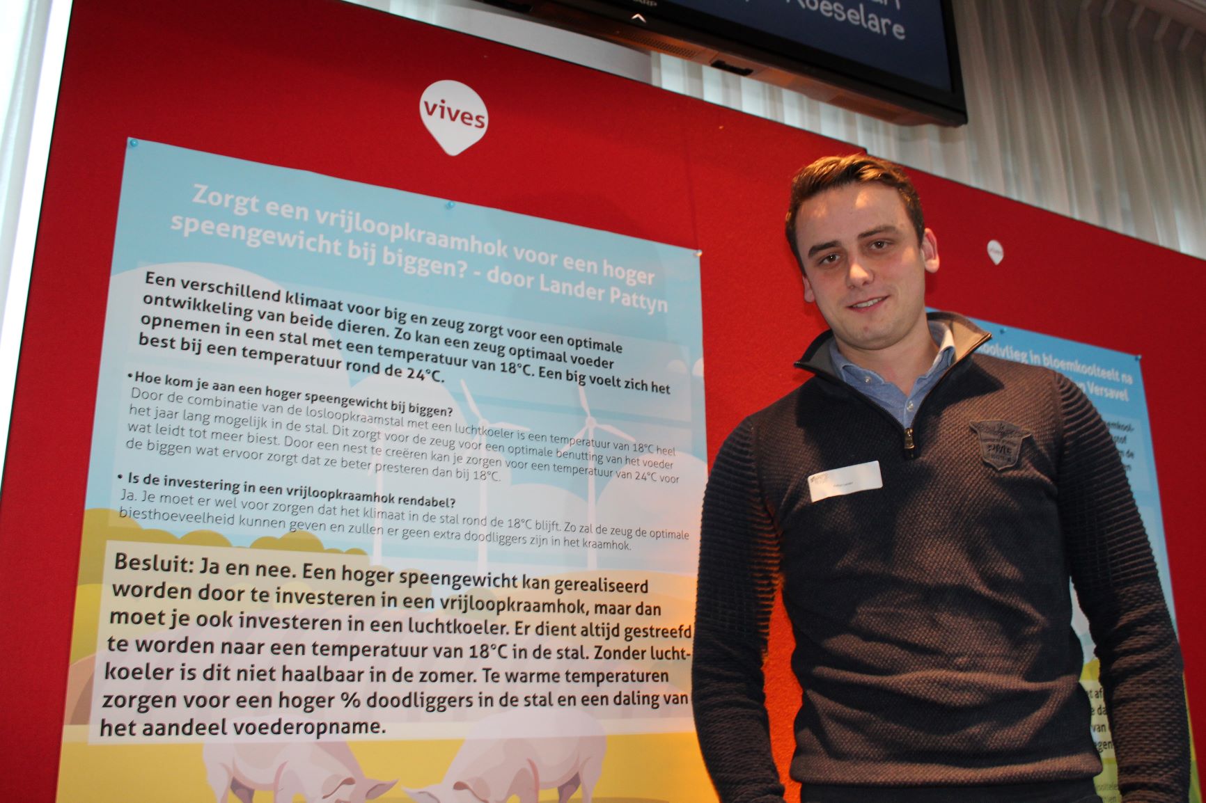 Voor zijn bachelorproef over het speengewicht bij vrijloopkraamkooien liep Lander Pattyn stage bij BVBA Bogaert Verhaeghe. Lander vergeleek de evolutie van het gewicht van biggen bij zeugen in vrijloopkraamkooien met die in de klassieke kraamkooien.